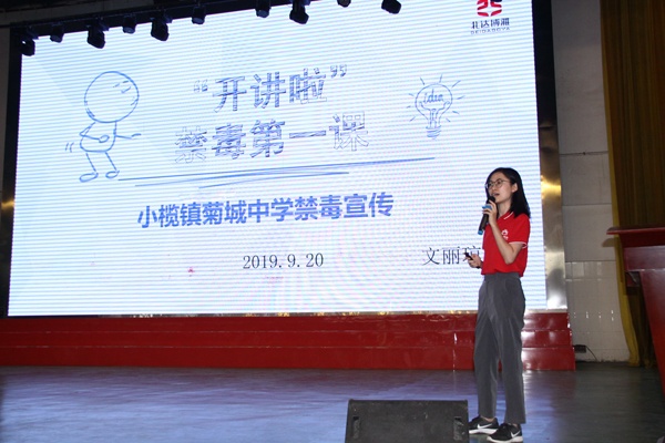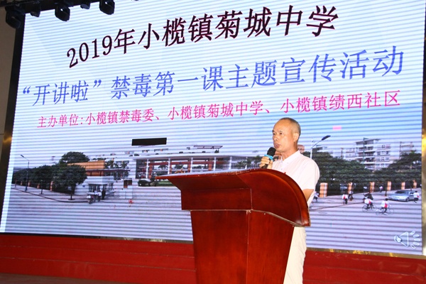 為了深入貫徹落實(shí)中山市禁毒工作,結(jié)合小欖鎮(zhèn)推進(jìn)三年“全民禁毒工程”攻堅(jiān)沖刺工作和青少年毒品預(yù)防教育“6·27”工程,提升青少年學(xué)生防毒識(shí)毒拒毒能力,營(yíng)造校園參與禁毒的濃厚輿論氛圍,9月20日下午,小欖鎮(zhèn)禁毒委、菊城中學(xué)和績(jī)西社區(qū)聯(lián)合在菊城中學(xué)舉辦“開(kāi)講啦”禁毒第一課主題宣傳活動(dòng)。舉辦單位的有關(guān)領(lǐng)導(dǎo),菊城中學(xué)1000多名師生參加了活動(dòng)。活動(dòng)由菊城中學(xué)鐘兆堂主任主持。