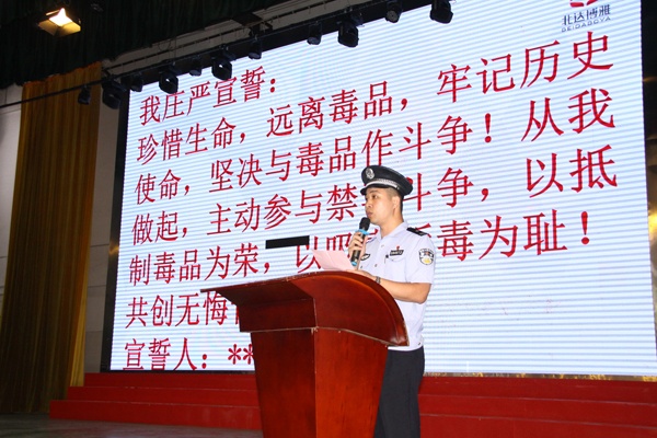 活動(dòng)在奏唱國(guó)歌中拉開(kāi)帷幕。菊城中學(xué)文炳發(fā)副校長(zhǎng)致辭。升平派出所警長(zhǎng)凌勇宣讀禁毒倡議書(shū),帶領(lǐng)同學(xué)們禁毒宣誓。活動(dòng)邀請(qǐng)了小欖鎮(zhèn)禁毒社工文麗瓊作禁毒知識(shí)講座,通過(guò)動(dòng)畫(huà)、案例讓同學(xué)們認(rèn)識(shí)了什么是毒品,了解了毒品有多毒,如何正確防范、抵制毒品。