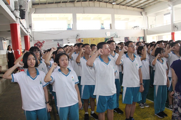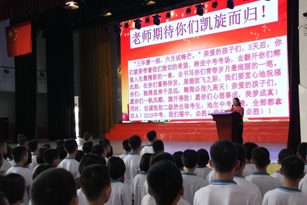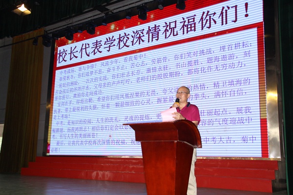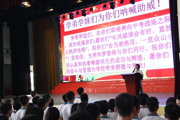 接著,繼初一學(xué)生代表萬冰冰同學(xué)為學(xué)長們獻(xiàn)上熱誠祝福后,初二、初三考生分別在雷毅、陸治君同學(xué)的帶領(lǐng)下,先后重溫了中考誓言。鏗鏘的誓詞,令人心潮澎湃,斗志昂揚(yáng)!
