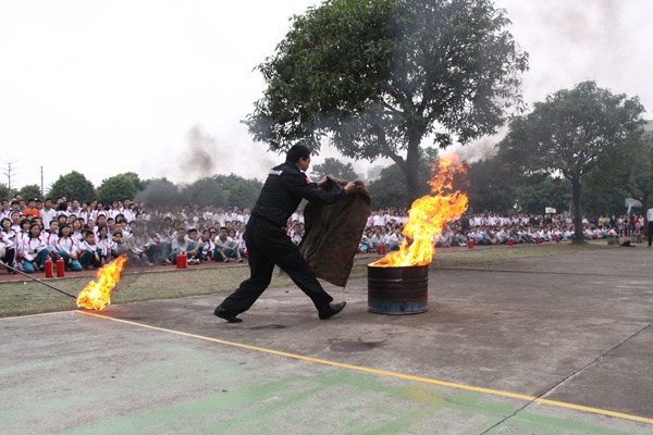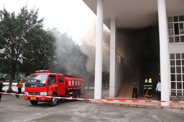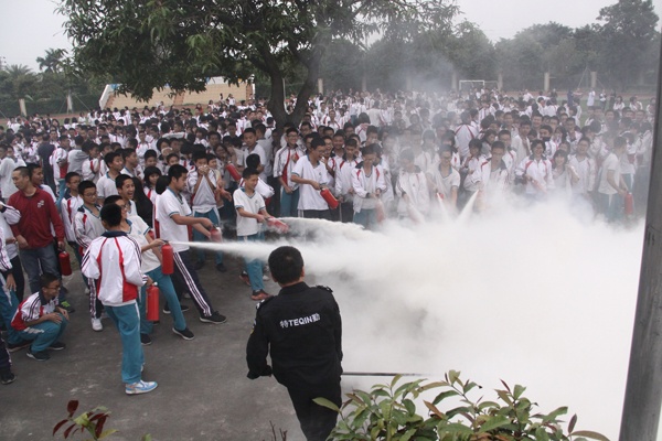下午4:30分,隨著學校有員工發現滾滾濃煙從飯堂冒出,立即向學校安全保衛組報告火情,接到和了解火災警情后,學校第一時間啟動火災安全疏散應急預案并拉響警報,學生在老師的引導下有序、快速地疏散撤離。各行動組立即行動,各就各位,全副武裝的消防員和消防車火速到場用消防車水槍進行滅火和救援。演習結束后,消防教官還現場給師生們講解和演示了用滅火器和麻袋滅火的知識和操作技能與注意事項,之后部分師生親自上場進行滅火操作實踐體驗。
