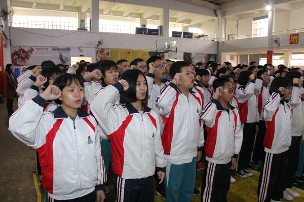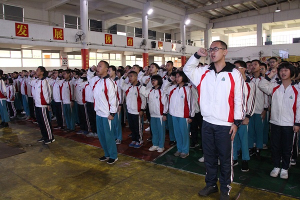 師長的肺腑良言,深深激蕩著中考學子們的心。如潮的掌聲過后,初三考生在學生會主席陸治君同學的帶領下,攥緊右拳激情宣誓:“堅定信念,無問西東;奮戰百日,折桂蟾宮;勤學苦練,不負青春;六月中考,我必成功!我必成功!我必成功!”初二學生也在雷毅同學的帶領下喊出誓言:“少看手機,不玩游戲;百日努力,考好生地;拒絕CD,誓拿AB;誓拿AB,誓拿AB!”鏗鏘激越的誓言,回蕩校園,直沖云霄!