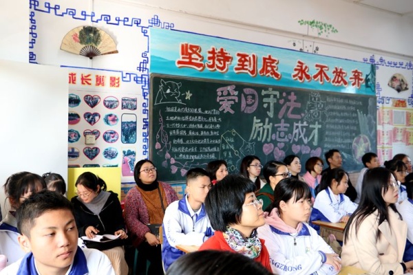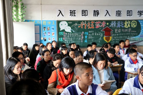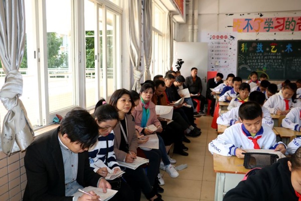 9:20,老師和家長們來到課堂聽課。講臺前,老師們各顯其能,有的神采風揚,激情澎湃;有的親切自然,循循善誘;有的詼諧幽默,情趣盎然……同學們更是專心聽講,發言踴躍,認真討論……師生互動,教學相長,笑聲不斷,掌聲不斷!聽課的老師、家長們則擠坐在教室后面,有的干脆就站在教室外面,他們個個全神貫注,時而低頭做筆記,時而點頭微笑,時而鼓掌叫好……