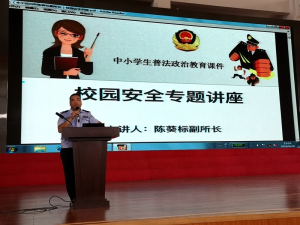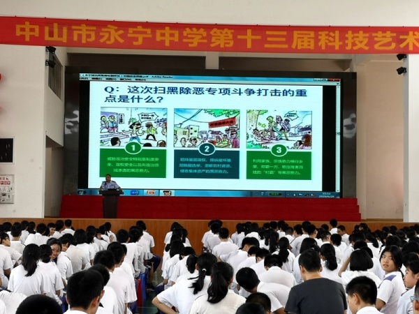 針對初三學生剛考完中考和即將畢業離校,為了讓初三學生平安、愉快、健康、安全渡暑假,永寧中學特邀永寧派出所陳葵標副所長為全體初三學生作《校園安全專題講座》。陳所長從新型毒品、掃黑除惡、掃黃打非三方面結合自身辦案經歷和典型案例,要求學生在第三代毒品面前要做到識物、識人、識環境、保持警惕意識;要求學生不準參與涉黑涉惡勢力團伙,認清黑惡勢力的危害,敢于向政法機關提供黑惡勢力犯罪線索,堅決同黑惡勢力作斗爭;要求學生們積極參與“掃黃打非”工作,不看黃色內容的書刊、音像制品、電子出版物和淫穢色情信息、不使用非法出版物等,共同維護健康的社會文化環境。學生們認真聽講,不時報以熱烈掌聲,表示認同和決心。