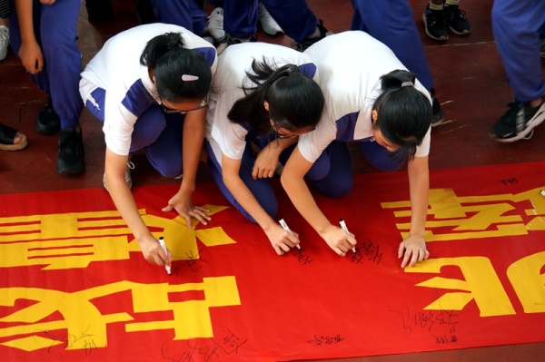 最后,全體初三同學在黃坤杰同學的帶領下,一起高舉右拳,大聲喊出:“理想學校,我們來了,加油,加油,加油!” 之后,初三學生代表和家長代表在“迎接人生挑戰,中考再創輝煌”橫幅上簽名留念,接著全體初三師生帶著堅定的目標、飽滿的自信、堅強的意志也在橫幅上鄭重簽名,表達“中考必勝”的信心。