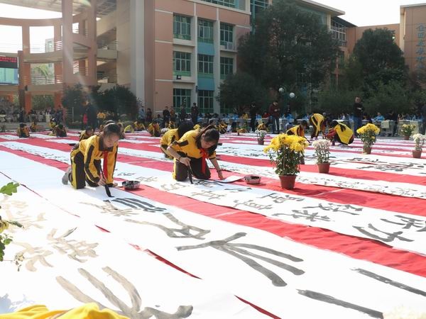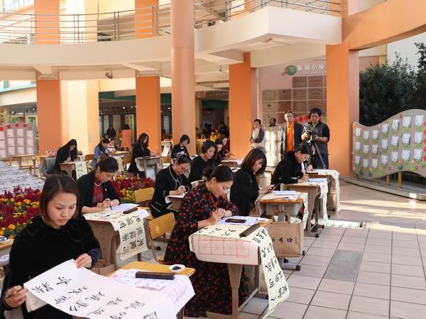 一走進菊城小學的校園,就看到一些孩子或蹲、或趴、或坐在鋪著紅毯的教學樓前的空地上,揮舞著大大的毛筆書寫著千年的傳統(tǒng)。有楷書、隸書、行書,也有草書、篆書,作品書體各異,渾厚圓潤,有如行云流水。兩邊是教師比賽方陣,無論是楷、隸、行、草,大家都是細細觀帖、靜靜思考、沉穩(wěn)書寫。老師們每周都有書法常規(guī)作業(yè),日積月累,也都有了一定的書法功底,深知寫好字的第一步是要學會讀帖,一筆一劃、一提一頓都體現(xiàn)出規(guī)范、法度。再往里走,在教學樓的大堂正中,是菊城小學“女子蘭花有約協(xié)會”的家長們,“蘭花協(xié)會”是菊城小學組織女家長成立的一個旨在提高她們綜合素養(yǎng)、修身養(yǎng)性的一個組織,常常舉辦一些教育、花藝、書法、讀書講座等活動。她們穿著傳統(tǒng)的旗袍,舉止大方,一顰一笑都體現(xiàn)出優(yōu)雅的風范。“蘭花”平時堅持書法練習,也有“每周作業(yè)”,所以,現(xiàn)場比賽她們也是從容不迫,胸有成竹。再往里走,在一樓大廳,布滿了幾個整齊的方陣,每個年級一個方陣,分別是二到六年級的學生代表,從坐姿、握筆,到書寫,每個細節(jié)都彰顯出老到,老成持重、大氣沉穩(wěn),各個字體、多樣形式,每個孩子在書法這個舞臺上盡情展示著個人的風采。就連最小的二年級小朋友,在臨摹字帖時,有模有樣,絕不含糊。再往里走,在一樓開放式的展覽區(qū)內(nèi),展示著菊城小學上百幅學生的六尺常規(guī)作品,充分展示了菊城小學在傳承、傳播書法傳統(tǒng)文化上的教育力度和走過的扎實的歷程。