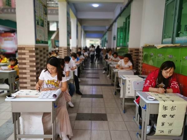一年級的小朋友第一次參加現場書法展示一點也不膽怯,硬筆書寫一筆一畫,有板有眼,沉著冷靜;高年級學生的毛筆書寫很好地做到了起筆、頓筆、收筆的流暢與一氣呵成,彰顯了常規的扎實訓練,作品整潔美觀、賞心悅目,絲毫不受天空的綿綿細雨所影響。教師展示區域,老師們行筆穩健,流暢自如,都在沉心臨習自己的碑帖,認真自信,展示了扎實的基本功底?! ?/p>