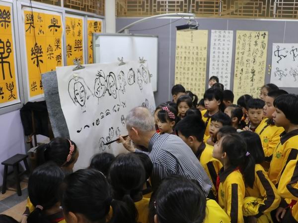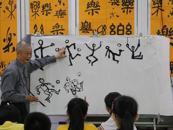 29日下午,受中山市菊城小學的邀請,方唐老師到菊城小學給國畫社團的同學們上了一堂有趣的水墨人物繪畫課。他系統地向學生傳授著人物繪畫的步驟與方法,重點強調人物動態的變化和把握。方老師一邊活潑生動地演示一個個動態,隨后把這些動態基本型畫出來,再逐步教導孩子如何根據動態基本型畫出完整的人物造型、深入刻畫人物的五官、表情,不一會兒,一幅充滿各種人物表情的生活動態圖就展現了出來,這生動的形象與直觀的教法引來孩子們“哇!哇!哇!”的夸贊聲。方老師還循循教導孩子畫畫一定要持之以恒,要善于觀察生活、記錄生活,遇到自己感興趣的人和事物動動畫筆畫出來,做好積累,建立自己的畫畫知識庫。畫多了,畫熟了,以后自己想要畫的造型就能馬上畫出來了。孩子們也不甘落后,紛紛在自己的小畫本上學著方老師的畫法,開始構思自己的作品,方老師都予以認真地指導。整節課孩子們都學得專注開心,熱情高漲,一邊聽課一邊不時向老師請教問題。現場的教與學的互動氛圍非常濃厚,同學們都非常喜歡童趣十足、幽默活潑的方唐老師,課后小畫迷都要方老師給自己簽名呢!
