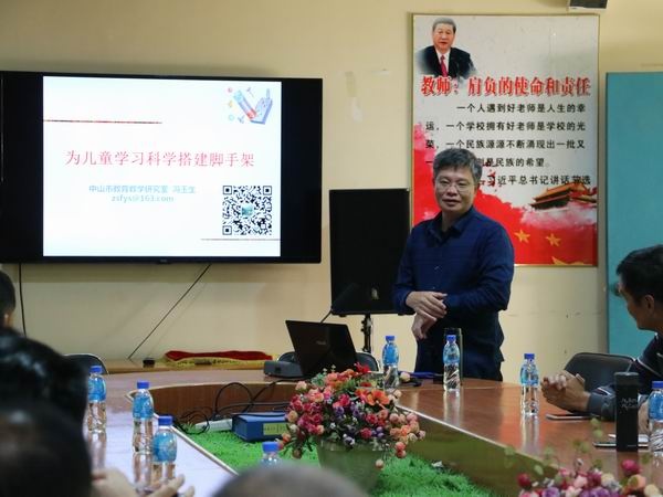 活動第一項議程是中山市教研室馮玉生部長給老師們做了一個科學課堂教學的指導性講座《給兒童學習科學搭建腳手架》。通過這次講座,老師們充分理解了什么樣的探究才是真探究,也體會到了科學探究、材料、提問和回答、任務單在兒童學習科學過程中重要的腳手架作用。馮部長的講座從理論到實踐、旁征博引,既讓老師們從理論的高度知道了為什么要這么做,也通過具體實例理解了該怎么做。馮部長在滿滿一個半小時的講座中侃侃而談,生動精辟的講座讓聆聽講座的老師們如醉如癡,時不時點頭贊嘆、時不時幡然醒悟。