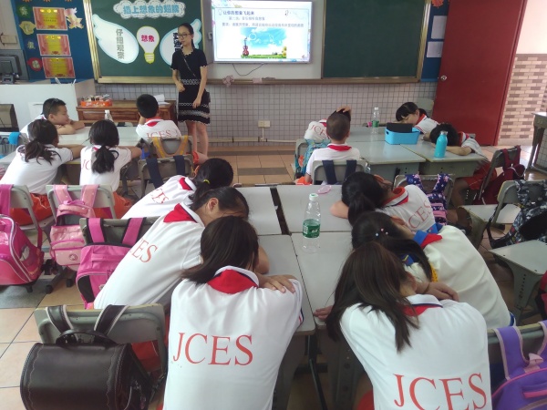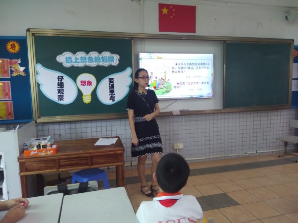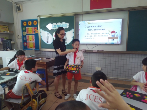 首先,由豐華學校張佩霞老師給四(5)班學生上了一堂精彩的心理活動課,主題為《張開想象的翅膀》。張老師帶領同學們通過有趣的熱身活動,讓大家迅速集中了注意力,投入到課堂當中。課堂開始時,張老師通過有趣的圖片引出了課題。接著通過兩個活動讓學生們掌握了想象的兩個法寶。同學們帶著想象的法寶進行闖關游戲,分別考驗了他們聽的想象、看的想象、用的想象。最后綜合運用創造想象,制作出屬于自己的作品。張老師語言風趣幽默,反饋豐富到位,孩子們在有趣的游戲當中,享受著想象的樂趣。