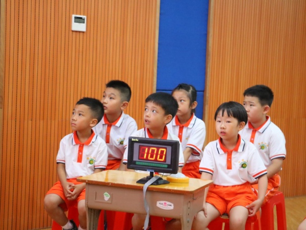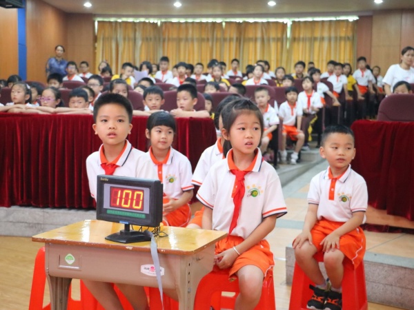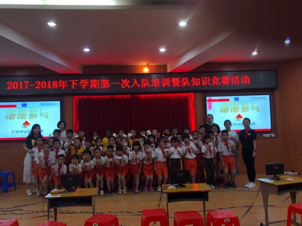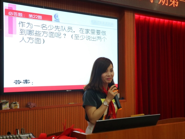 本次入隊(duì)培訓(xùn)以知識(shí)競(jìng)賽的形式展開(kāi),由大隊(duì)副輔導(dǎo)員王甜老師和關(guān)永釧老師組織。競(jìng)賽開(kāi)始前,王甜老師帶領(lǐng)所有隊(duì)員和同學(xué)們邊唱隊(duì)歌邊做手語(yǔ)操。接著,各中隊(duì)少先隊(duì)員代表和預(yù)備隊(duì)員組成答題小隊(duì)。本次競(jìng)賽分為必答題、搶答題和實(shí)操比賽題三個(gè)環(huán)節(jié)。必答題要求各隊(duì)先選擇題號(hào),每隊(duì)必須答3題,答對(duì)加10分答錯(cuò)或不答不扣分,觀眾可以補(bǔ)答。在第一輪的比賽中所有的隊(duì)伍抽中的題目全都答對(duì),這也體現(xiàn)了隊(duì)員們對(duì)少先隊(duì)知識(shí)都比較了解。最激動(dòng)人心的是搶答題環(huán)節(jié),這需要隊(duì)員們眼疾手快,通過(guò)這一環(huán)節(jié)的比拼,每一個(gè)小隊(duì)的分?jǐn)?shù)也拉開(kāi)了差距。實(shí)操項(xiàng)目,要求參賽隊(duì)員在規(guī)定時(shí)間內(nèi)自己系好紅領(lǐng)巾,關(guān)永釧老師面對(duì)所有隊(duì)員和預(yù)備隊(duì)員們當(dāng)場(chǎng)演示正確系紅領(lǐng)巾的方法和敬標(biāo)準(zhǔn)隊(duì)禮的姿勢(shì)。在整個(gè)活動(dòng)中各中隊(duì)隊(duì)員們和預(yù)備隊(duì)員們參與的積極性非常高。