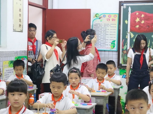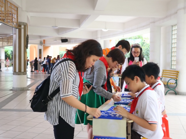 學校少工委主任、校長陳玉玲代表學校熱情接待了培訓班一行。陳校長向大家介紹了小欖鎮(zhèn)——中山小欖是“菊城”,是書法之鄉(xiāng)、教育強鎮(zhèn)。她還介紹了學校的辦學理念、辦學特色與辦學歷程。接著她陪同客人們參觀了少先隊陣地和紅領巾社團。大家首先參觀了益智游戲項目的集中展示。隊員們?yōu)榇蠹以佻F(xiàn)了“小組PK”“擂臺賽”“個人挑戰(zhàn)”等日常項目活動。接著大家自由走進了菊城小學38個中隊,感受動感中隊特色文化。由于天氣原因,38個中隊在室內常態(tài)展示了益智游戲活動——每個年級的游戲都不一樣,每個中隊展現(xiàn)的形式也不一樣。這給客人們留下了深刻的印象——菊小的益智游戲不僅全員參與,還有效解決了遇到特殊天氣,隊員們無法開展課間游戲活動的問題。學校的益智游戲由學校思維中心主導開展,堅持了多年。