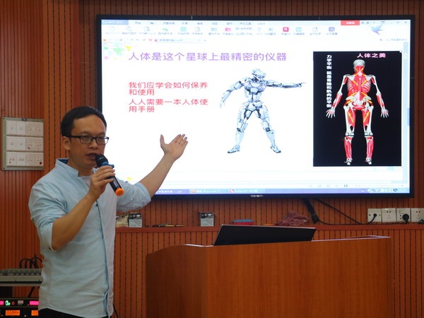 薛煒醫(yī)生用淺顯易懂的語言,時而用醫(yī)學名詞,時而用英文和學生交流,時而舉學生看過的動畫片為例,向?qū)W生零距離地介紹了人體的結(jié)構(gòu),如何對身體進行保養(yǎng)和使用。