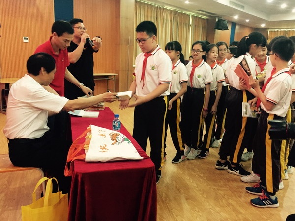 活動最后,周大新老師為六年級同學簽名留念,同學們手捧周老師的作品,有序地排隊等候。在簽名過程中,有很多孩子跑到周老師身邊,將自己的想法與老師進行交流……