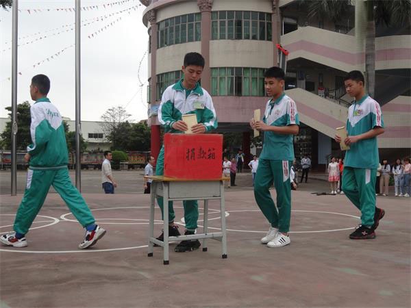 倡議書宣讀完畢后,全校師生以班為單位,按順序上主席臺進行捐款,整個會場秩序井然,莊嚴肅穆,人人盡獻愛心,為慈善事業奉獻自己的力量。
