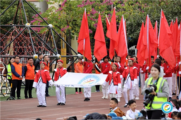 看,鮮艷的五星紅旗在前面引路!首先入場的是國旗方陣。四名少先隊員高擎五星紅旗,邁著整齊的步伐,雄赳赳、氣昂昂地步入運動場,嶄新的旗幟在陽光下熠熠生輝。緊跟在國旗后面的是校旗方隊,他們堅實鏗鏘的步伐,展示著廣源學校銳意進取、團結向上的人文形象和廣源人開拓創(chuàng)新,砥礪前行的精神風貌。