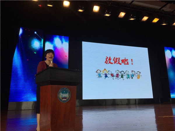 暑假的腳步正向孩子們走來,陳立副校長笑容可掬,她圍繞假期注意事項,以親和的語音向大家娓娓道來,孩子們認真傾聽。當她宣布“放假啦!”場內發出熱烈的掌聲。