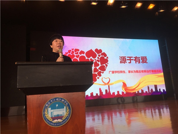 涓涓細流成海洋,點點愛心凝希望。陳志老師的病情牽動著廣源學校全體師生、家長的心。捐款現場,陳立副校長號召全校師生積極行動起來,慷慨解囊,為困境中的陳志老師送去生的希望和永恒的溫暖;五(1)班學生代表陳宇寧同學回憶著往日與陳志老師一起學習、一起玩耍的歡樂時光,號召同學們向陳志老師伸出援手。在校領導的帶領下,全校教職工、學生、家長代表依次捐款;實習老師、離職教師及許多往屆學生也紛紛伸出援手;兩位一年級小男孩撿到一元錢,交到行政處,說要捐給患病的陳志老師;有的孩子忘記帶錢,家長們親自把善款送到學校來……一股股愛暖流由一顆顆滾燙的愛心匯成,給厄運中的人以無限的力量?,F場共籌集善款(人民幣)452214.9元。