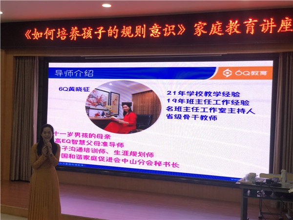本次家長會分兩部分進行,首先由中山市名班主任工作室的主持人、省級的骨干教師、親子溝通培訓師、中國和諧家庭促進會中山分會秘書長黃曉征老師來進行題為“如何培養孩子的規則意識”家庭教育講座。黃曉征老師從四年級學生的心理發展特認識點出發,針對學生在家里、社會所普遍存在的問題,指導家長如何有效地對孩子進行教育。黃曉征老師運用多種方式,把孩子的心理狀況和行為特征描述得生動形象。家長們在輕松愉悅的氣氛中,了解了孩子的發展特點,也學習了如何與孩子平等相處、相制約定。