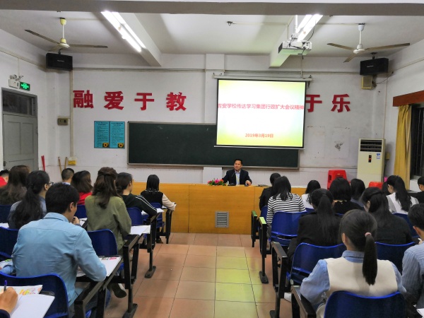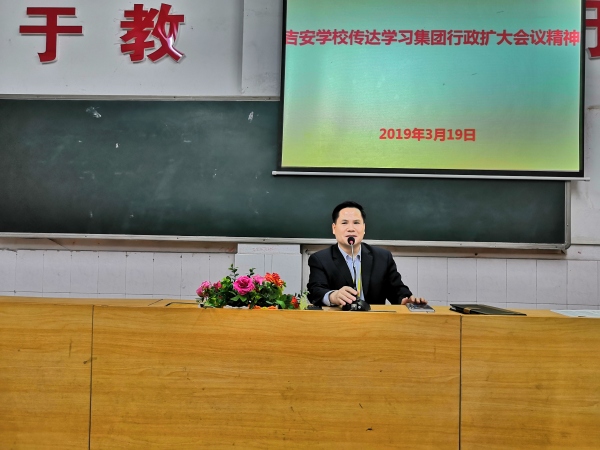 2019年3月19日晚,吉安學校在多媒體會議室召開全體教師會議。本次會議的主要內容是向全體教師傳達集團行政擴大會議的精神,同時學習和強調在工作中如何落實兩會精神、踐行集團發展理念、教育理念和管理理念。