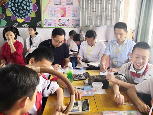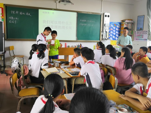 第三課由數(shù)學組兼職教研員胡誠老師帶來的一節(jié)趣味的《探索圓的周長》。胡老師通過活動——推導公式——應用公式來貫穿整節(jié)課。胡老師注重引導學生動手實踐,在操作中理解知識,發(fā)展思維。胡老師通過讓學生觸摸圓的周長,引發(fā)了如何求圓的周長問題,再通過實際操作測量讓學生明白可以通過“化曲為直”的方法求圓的周長,最后通過小組合作探究圓的周長與直徑的關系,推導出公式。在匯報交流中,羅美園副主任指出胡老師這節(jié)課課抓住了知識點的形成,學習方式多樣化,讓學生體會了數(shù)學來源于生活,服務于生活。