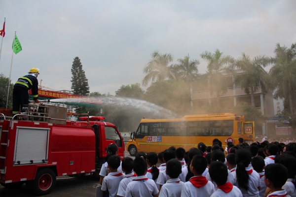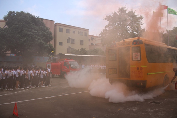 為了將這次演練落到實處,能取得較好的效果。在演練活動前制定了詳細的校車疏散演練方案。9月12日下午3時,隨著嘹亮的進行曲音樂聲,吉安學校全體司機、隨車教師及師生有序地進入操場,部分家長也到場觀摩。3時8分,小欖鎮文體教育局盧穎禧局長宣布演練開始,隨著發令員的一聲槍響,吉安學校1號校車從主席臺前方徐處開來,廣播里傳來主持人的解說:現在吉安學校校車在公路上正常行駛,突然學生大叫:校車有煙!……司機、隨車教師和乘車同學分別按照校車消防應急疏散方案的指令和要求,快速撤離事故校車,到達指定地點集合,沒有發生任何意外情況,整個演練過程做到快速、有序、安全,較好的完成逃生演練的任務。接著,由吉安學校負責安全工作的農洪藝老師,向師生們介紹安全錐和滅火器在遇到危險時候正確使用的方法。通過模擬演練和講解增強了師生在遇到緊急情況下逃生的技能。