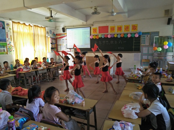 接著各年級各班根據學生年齡特點開展活動,低年級,主要以美食、游戲為主,吃著家長為孩子們精心準備的清涼六一大餐,玩著有趣的小游戲,孩子們的臉上洋溢著幸福的笑容。中高年級,以才藝展示,游戲娛樂為主。同學們用歌唱、舞蹈、小品、快板、詩朗誦、等形式抒發了心中的喜悅之情,他們精彩的表演,把歡樂的氣氛推向一個又一個的高潮。孩子們甜美的嗓音,活潑優美、動感時尚的舞姿,盡情展示了孩子們天真、可愛、純真的天性。其中學校拉丁舞隊為同學們帶來了別樣的表演,這個節目經過老師們精心地準備,孩子們辛苦地排練,活動現場成功演出,贏得了同學們的陣陣掌聲。再者校園游園活動:盲人擊鼓、挾乒乓球、貼鼻子、猜謎語等系列活動也如火如荼的進行著。快樂總是短暫的,在掌聲中,在歡笑聲中,在放學的鈴聲中,本次活動圓滿結束。