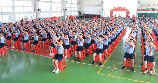 全校師生共同參與了此次比賽活動(dòng),各班級(jí)同學(xué)穿著整齊,精神抖擻,步伐自信。音樂響起,比賽開始了,隨著動(dòng)感韻律,一雙雙小手繚繞向上,如行云流水,向陽而升,形舒意廣;一雙雙小手整齊劃一,向兩邊舒展,孩子們的心兒也隨著那展開的雙臂,遨游在無垠的太空;一雙雙小手握拳,向左搖,劃出了一道彩虹,向右搖,藍(lán)了一片天空;踏著跳動(dòng)的音符,同學(xué)們時(shí)而像燕子伏巢將醒,時(shí)而像鵲鳥展翅欲飛,有力的雙臂揮舞斗志,靈動(dòng)的身軀呼喚夢(mèng)想。點(diǎn)點(diǎn)頭,甩甩肩,揮臂間,踢走疲勞,消除焦慮,釋放情緒,喚醒能量。