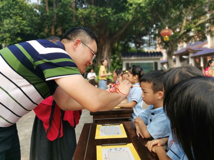 “開筆禮”活動在煙洲書院舉行,煙洲小學(xué)131名一年級新生及其家長參加了此項盛典。孩子們懷著無限的憧憬和期待,在老師們和家長們的引領(lǐng)下,在擁有147年歷史的煙洲書院中開啟了人生的新篇章。“開筆禮”在副校長楊志堅敲響的鐘聲中拉開了帷幕,活潑可愛的孩子們認(rèn)真聆聽了校長黃文華的對他們的諄諄教誨,接著在悠揚(yáng)的傳統(tǒng)音樂聲中,老師們?yōu)槿w孩子“朱砂啟智”,寓意孩子們能夠開啟智慧,從此耳聰目明、心靈手巧。然后就是家長們認(rèn)真地教孩子們書寫“人”字。以“人”開筆,寓意著孩子從小就要認(rèn)識到學(xué)會做人的重要性,將來做一個頂天立地的人。“人”字寫好后,孩子們由家長領(lǐng)著緩緩走進(jìn)莊嚴(yán)神圣的煙洲書院參拜萬世先師孔子。羅勇志老師帶領(lǐng)全體學(xué)生整理衣冠,誦《弟子規(guī)》(節(jié)選),三拜圣人孔子,三擊鼓明志,三位學(xué)生代表向老師敬茶,這些都寓意著學(xué)生們要尊師孝親、崇德立志、仁愛處世的中華傳統(tǒng)文化精髓,樹立“善 ” “正 ”行為規(guī)范,汲取尊師愛學(xué)的思想精華。最后,何彩云老師代表全體老師作了發(fā)言,表了決心。