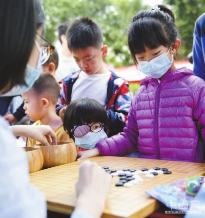12月13日,東區公益集市活動的圍棋攤位前,一名正在進行視力治療的小女孩專注地看著棋盤。本報記者 余兆宇 攝