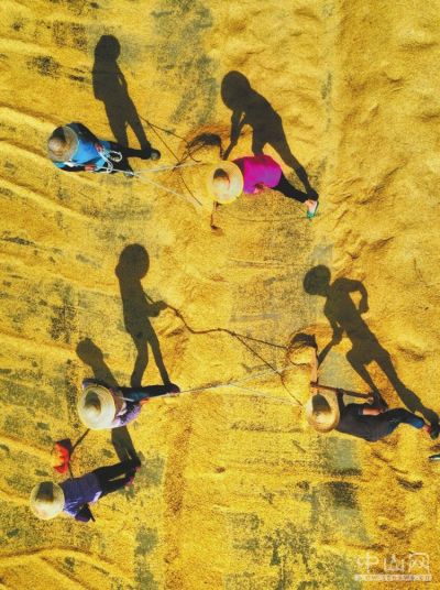7月2日,一批農民在曬谷場翻曬稻谷。2020年6月下旬至7月上旬,中山市南朗鎮崖口村夏糧喜獲豐收,全村農民不畏酷暑,頭頂烈日在曬谷場上鋪開谷子、隔時翻曬,呈現一派忙碌的景象。金燦燦的谷子是底色,烈日當頭下的人和影是詩行,一幅美妙的圖畫定格在低空俯拍的無人機的鏡頭中。 本報記者 文智誠 攝