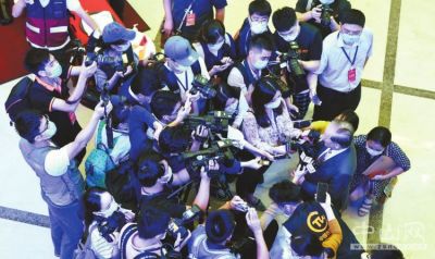7月17日,第四屆海峽兩岸中山論壇在中山市開幕,論壇以“弘揚中山精神、共謀民族復興”為主題。開幕式后,參加論壇的嘉賓被眾多媒體記者圍住采訪。本報記者 文波 攝