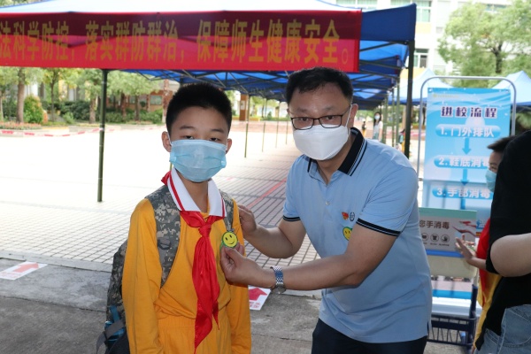 復學大禮包:校門口,同學們保持1米的安全距離,循著地面的安全線有序站位,經過嚴格的三道檢測——鞋底消毒+手部消毒+測量體溫,就能獲得開學第一件禮物——一枚大大的“笑臉”徽章,“笑臉”后面藏著中心小教師們百日來數不盡的思念、溫情、鼓勵與期許。
