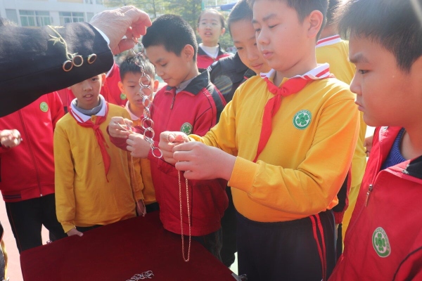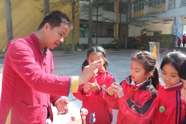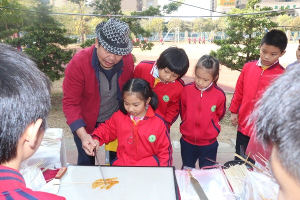 “老師,那個字寫得好漂亮!”“老師,那個魔術(shù)環(huán)好神奇……”早上8點,一二年級的班主任便帶領(lǐng)著學(xué)生來到活動現(xiàn)場,拉開了本次研學(xué)活動的帷幕。活動現(xiàn)場設(shè)立糖畫、捏面人、草編、皮影、中國結(jié)、龍鳳字、銅線藝術(shù)手工、剪紙藝術(shù)等16個傳統(tǒng)民俗手工攤位,豐富多彩。師生們可以在每個攤位觀摩手工藝人的現(xiàn)場展示或者現(xiàn)場制作,感受民俗手工藝術(shù)的神奇;可以通過傾聽手工藝人們現(xiàn)場講解,了解傳統(tǒng)文化知識;還可以通過親身體驗,進(jìn)一步了解傳統(tǒng)手工制作工藝……為了確保每個學(xué)生都有足夠的時間去觀摩與體驗,本次研學(xué)活動分了低中高三個年級段的觀摩體驗時間,活動現(xiàn)場雖熱鬧非凡卻井然有序。