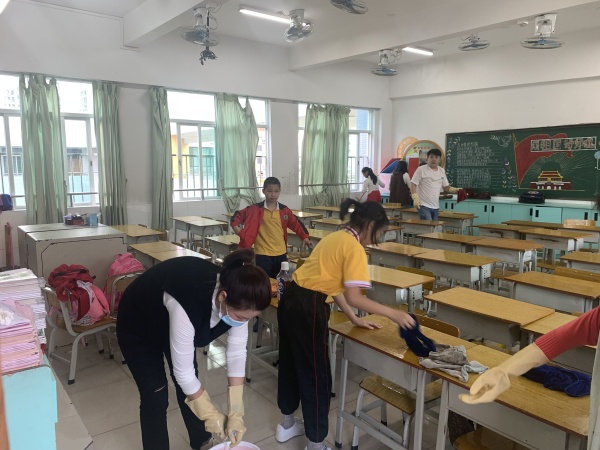 會議后,班主任回到班級,與家長和孩子一起,對教室、走廊等師生主要活動區域進行了消毒。無論是地板、桌面還是講臺,都認真擦拭了一遍。