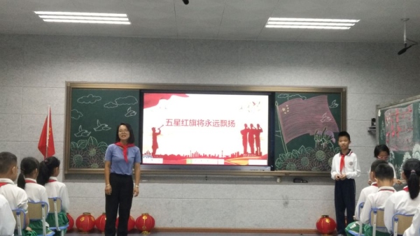 各中隊圍繞愛國主題選擇主題班會或中隊會的形式開展活動。每一個中隊的活動都精彩紛呈,可圈可點。其中二(3)中隊的《我給祖國慶生日》和四(2)中隊的《耀眼的旗幟》主題中隊會最為精彩。
