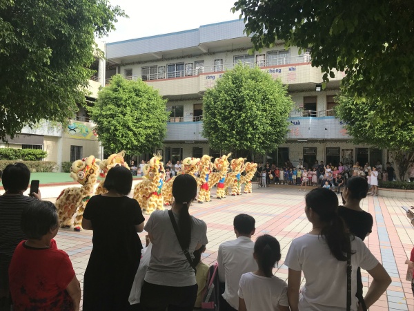 一年級三個教室里,老師們早已靜候在課室里與新來的孩子們親切握手,微笑交談。隨后老師們帶著孩子們與家長一起觀看了學校龍獅隊為一年級全體新同學、家長表演精彩的舞龍舞獅。