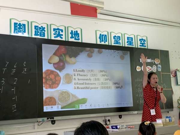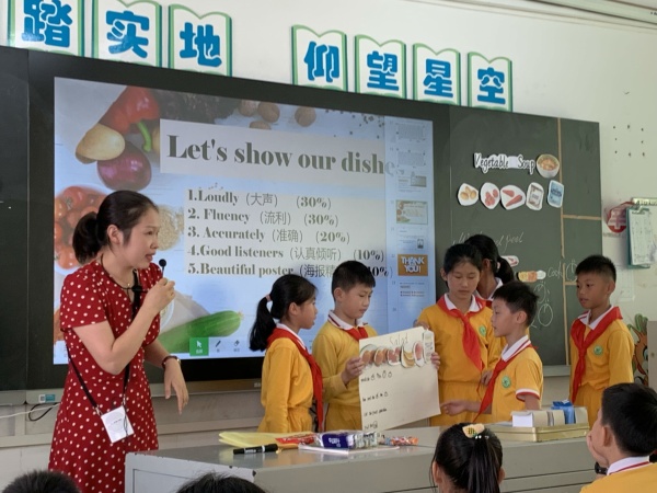 接著,由西區廣豐小學的吳曉霞老師執教了一節五年級的閱讀課——Unit 5 School Lunch(Vegetable Soup),吳老師能夠準確把握學生的年齡特點,以舊引新,圖文并茂,有趣的教學內容,形式多樣的教學手段,激發了學生的參與熱情,引導學生分析理解文本,找出關鍵信息,注重發展學生的實踐能力和創新精神。