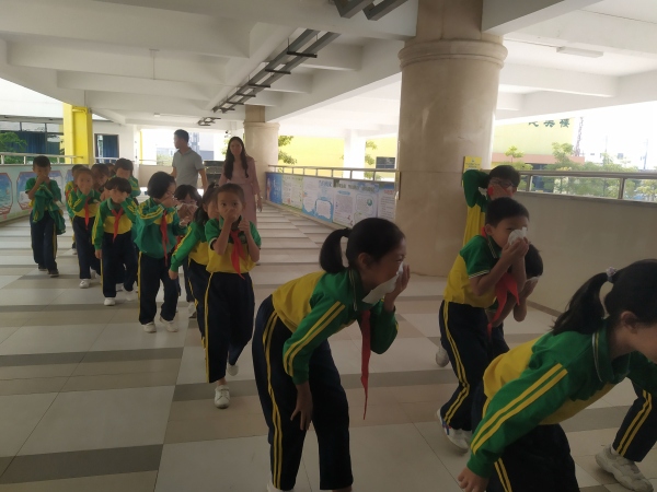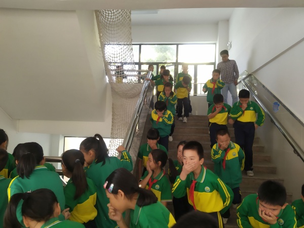 上午9時(shí)40分,西區(qū)廣豐小學(xué)警報(bào)聲響起后,老師們迅速做出反應(yīng),在各自負(fù)責(zé)的位置引導(dǎo)學(xué)生疏散。學(xué)生們在老師的帶領(lǐng)下,用濕毛巾或用手掩住口鼻、彎腰伏背,按照事先設(shè)定好的逃生路線,快速、安全、有序地撤離教學(xué)樓。