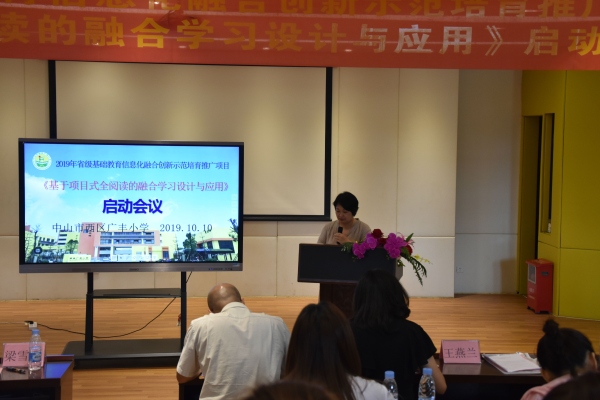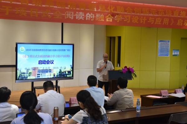 2019年10月10日,廣豐小學的報告廳里迎來了幾位專家,他們分別是中山市教育教學研究室梁雪菊老師,中山市教育信息中心吳宇清副主任、陳志豪部長,以及西區教育事務指導中心英語教研員姚佳老師。今天,他們將在這里和廣豐小學的校長、老師們一起為廣東省基礎教育信息化融合創新示范培育推廣項目之“基于項目式全閱讀的融合學習設計與應用”項目開展項目啟動活動。