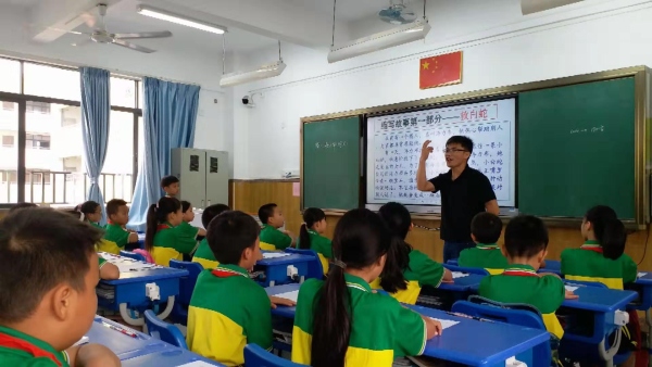 另一位是劉偉華老師,他展示的課例是《獵人海力布》縮寫。劉老師的教學(xué)方法獨(dú)具匠心。《獵人海力布》這篇文章按內(nèi)容分為四部分。劉老師首先把文章的第一部分縮寫與原文進(jìn)行比較,讓學(xué)生找出異同,并與學(xué)生探討為什么要這樣縮寫,從而引導(dǎo)學(xué)生總結(jié)出縮寫的方法:1.摘錄重點(diǎn);2.刪減次要;3.概括情節(jié);4.改寫對(duì)話。當(dāng)學(xué)生初步懂得縮寫方法后,劉老師采取“半扶半放”的方式指導(dǎo)學(xué)生對(duì)文章第二部分進(jìn)行縮寫。通過師生交流,學(xué)生對(duì)縮寫的方法逐漸明朗了。最后,劉老師完全放手讓學(xué)生縮寫文章的第三部分。整個(gè)教學(xué)過程中,體現(xiàn)了學(xué)生由不會(huì)到會(huì),劉老師扎實(shí)的教學(xué)基本功讓在座的老師受益匪淺。