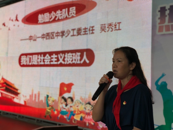 學(xué)校少工委主任莫秀紅發(fā)表了“我們是社會(huì)主義接班人”的講話,她首先問隊(duì)員們兩個(gè)問題: “2021年,中國共產(chǎn)黨成立100年的時(shí)候,你們幾歲了?在干什么?2049年,中華人民共和國成立100年時(shí),也就是30年以后,你們幾歲了?有可能在干什么?”莫主任的引發(fā)了隊(duì)員們的思考,莫主任繼續(xù)說:“2021年,14、15歲的你們要面對(duì)中考,憑實(shí)力爭取一個(gè)優(yōu)質(zhì)高中學(xué)位;2049年,40多歲的你們恰好是年富力強(qiáng)、建設(shè)社會(huì)主義的生力軍,你能預(yù)估那個(gè)時(shí)候你的身份是什么嗎?”她衷心希望每一位少先隊(duì)員在初中三年重視核心素養(yǎng)的培養(yǎng),逐步形成適應(yīng)個(gè)人終生發(fā)展和社會(huì)發(fā)展需要的必備品格與關(guān)鍵能力,努力成長為全面發(fā)展的社會(huì)主義建設(shè)者和接班人。