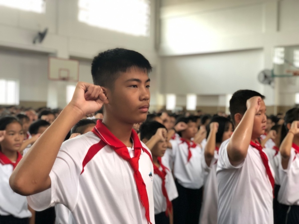 最后,在大隊(duì)輔導(dǎo)員蔡潔瑩老師的帶領(lǐng)下,同學(xué)們舉起右手,莊嚴(yán)宣誓:“我是中國少年先鋒隊(duì)隊(duì)員,我在隊(duì)旗下宣誓……”同學(xué)們激情澎湃,響徹校園的呼號(hào)聲和歌聲彰顯著每一位中山一中西區(qū)中學(xué)少先隊(duì)員勵(lì)志學(xué)習(xí)、成就自我的決心。