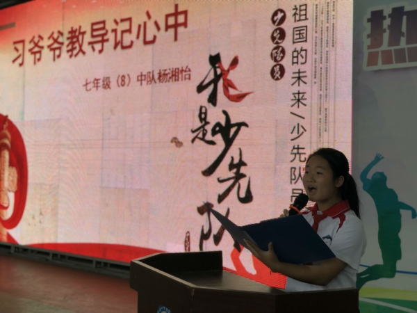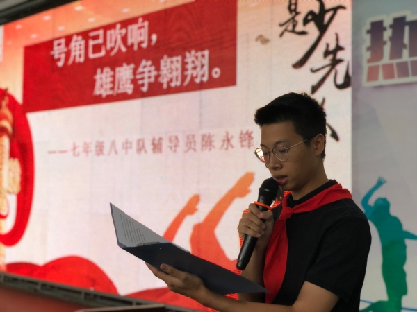 少先隊(duì)中隊(duì)輔導(dǎo)員陳永鋒老師發(fā)表主題為“號(hào)角已吹響,雛鷹爭翱翔”的講話,陳老師講到2019 年是重大節(jié)日、紀(jì)念日較為集中的一年,五四運(yùn)動(dòng) 100 周年、新中國成立 70 周年、少先隊(duì)建隊(duì) 70 周年等時(shí)間節(jié)點(diǎn)使得青少年思想政治引領(lǐng)工作更顯重要,學(xué)校少工委以今天的“號(hào)角已吹響,雛鷹爭翱翔”主題活動(dòng)為契機(jī),增強(qiáng)少先隊(duì)員光榮感,幫助中學(xué)少先隊(duì)員快樂度過這承上啟下的重要人生階段,為廣大少先隊(duì)員的健康成長和全面發(fā)展保駕護(hù)航。他叮囑并激勵(lì)著少先隊(duì)員們應(yīng)時(shí)刻準(zhǔn)備著,為實(shí)現(xiàn)中華民族偉大復(fù)興貢獻(xiàn)力量!