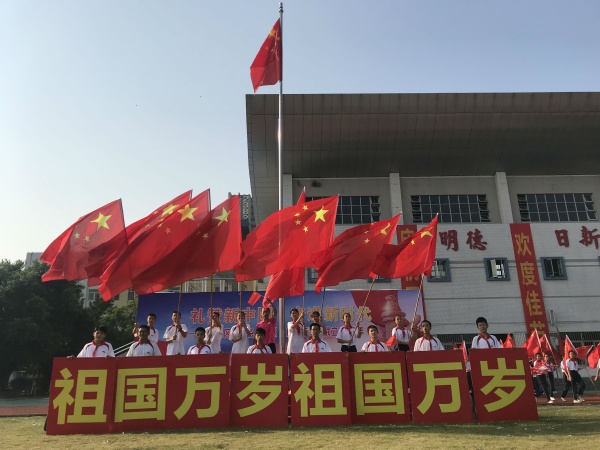 接著范振海校長做了主題為《為祖國放歌》國旗下講話。范校長講到“70年披荊斬棘,70年風(fēng)雨兼程。”一路走來,中國人民自力更生、艱苦奮斗,創(chuàng)造了舉世矚目的“中國奇跡”。短短幾十年時間,當(dāng)代中國實(shí)現(xiàn)了從落后時代到趕上時代、引領(lǐng)時代的偉大跨越,中華民族迎來了從站起來、富起來到強(qiáng)起來的偉大飛躍。我們已經(jīng)是世界第二大經(jīng)濟(jì)體,是制造業(yè)第一大國、貨物貿(mào)易第一大國、外匯儲備第一大國、高速公路總里程世界第一、全世界超過2/3的高鐵軌道鋪設(shè)在中國、超過1/3的5G標(biāo)準(zhǔn)必要專利掌握在中國。我們每一個人,特別是作為祖國花朵的同學(xué)們,更加有責(zé)任、有義務(wù)擔(dān)起實(shí)現(xiàn)偉大中國夢的重?fù)?dān)!實(shí)現(xiàn)偉大中國夢要從身邊做起, 從小事做起,從現(xiàn)在做起,尊敬師長,團(tuán)結(jié)同學(xué),努力學(xué)習(xí),天天向上,樹立為民族強(qiáng)盛而努力奮斗的偉大理想,自強(qiáng)不息,做一個有理想、有能力、有擔(dān)當(dāng)?shù)纳鐣髁x事業(yè)的接班人!范校長的講話激奮人心,激發(fā)了在場所有人濃濃的自豪感和愛國情懷,也讓同學(xué)們將個人理想與祖國發(fā)展緊密聯(lián)系,努力在新時代有新作為,以實(shí)際行動向新中國成立70周年獻(xiàn)禮。