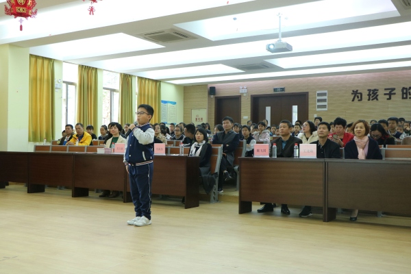 活動開始前,全場兩百多人津津有味地欣賞了鐵城小學舉辦的國防教育班會課、手抄報、主題親子活動等精彩照片,在場的領導嘉賓對鐵小舉辦的各類活動頻頻點贊。三點半,活動在鐵城小學張文君副校長的主持下正式開始。首先,由六(3)班學生代表劉楚銘發言,他號召同學們從身邊的小事做起,熱愛學習、強健體魄,樹愛國之心,立報國之志,心懷強國夢。接著,由老師代表袁軍作題為《少年智則國智,少年強則國強》的主題發言。袁老師回顧中國開展國防教育的源遠歷史,強調“國不富則無稱雄之本,兵不強則無爭霸之力”的政治主張,并從毛主席、周總理、祖逖、司馬光等名人從小立志報國為例,引用梁啟超的名句“少年智則國智,少年富則國富,少年強則國強”,勉勵全體學生努力學習科學文化知識,走高科技強國之路,用熱血筑起一道堅固的國防。接下來,由李嘉俊帶全體同學一起朗誦《少年中國說》節選,同學們激情滿滿,用鏗鏘有力的朗誦表達報效祖國的堅定決心,充分展示了國防教育的感染力、滲透力。