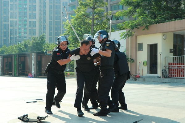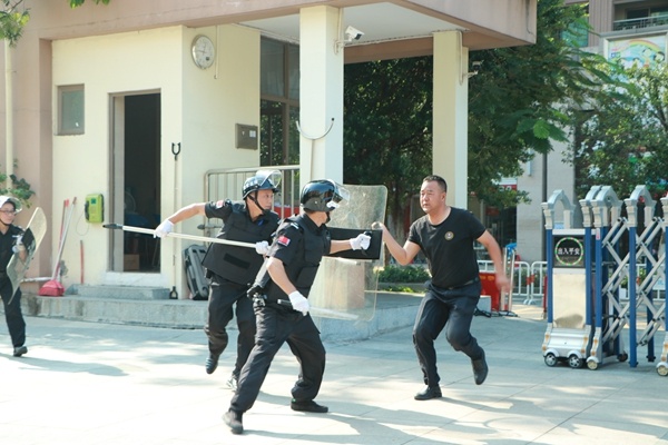 9月24日大課間,全體師生準備集隊前往操場,一名“暴恐分子”(扮演)手持長刀沖進校園,學校保安看到此景后,立即吹響哨子,迅速拿起盾牌、大頭棒等器械沖出來,齊心協力將其制服。演練過程中,保安人員反應迅速、配合默契,采取處置措施及時、合理,表現出良好的處突能力。