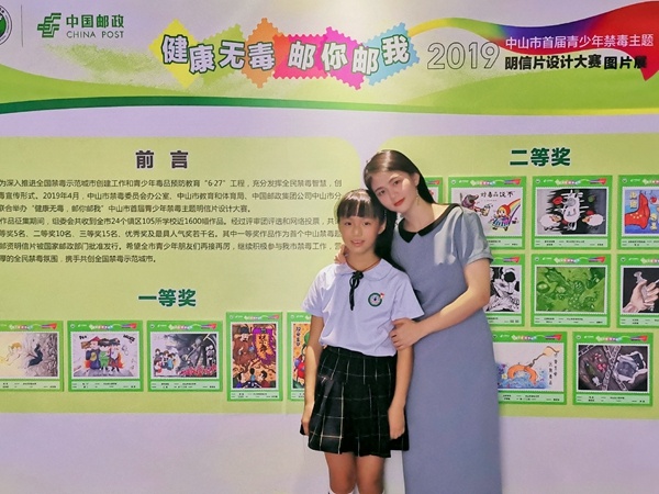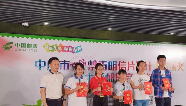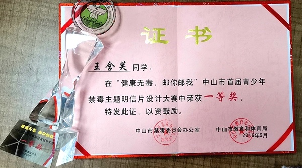 9月19日,在中山市禁毒教育科普館舉行中山市首屆禁毒明信片設計大賽頒獎暨主題郵局啟動儀式。根據審團評選和網絡投票,中山市西區鐵城小學的王含芙同學獲得一等獎(全市5個一等獎名額)、楊謹寧同學獲得優秀獎,林秀媚老師被評為“優秀指導老師”。據悉,王含芙的作品也作為首個中山市禁毒題材的郵資明信片,被國家郵政部門批準發行。頒獎嘉賓表示,希望全市青少年再接再厲,繼續積極參與中山市禁毒工作,營造濃厚的全市禁毒氛圍,攜手共創全國禁毒示范城市。