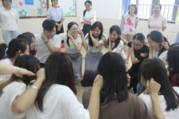 活動中,劉老師幽默風趣地進行自我介紹,然后以輕松愉快方式引領全體教師進入游戲環節。 游戲開場是“我說你做”。劉老師讓老師們打開右手食指和大拇指跟著她做,然而她把手勢放在額頭上,有的老師的手勢卻是放在下巴下,老師們不知所措,聽到的是放額頭上,但是講師自己卻放在下巴下。劉老師告訴大家:看到的不一定是真相,要相信自己聽到的。接著,又進行了“左手抓、右手放”和“雞蛋變鳳凰”等游戲,劉老師通過多個快樂的游戲活動,引導老師們一步步釋放自己的心理壓力,展現真實的自我,置身于活動中的老師們都開懷大笑。