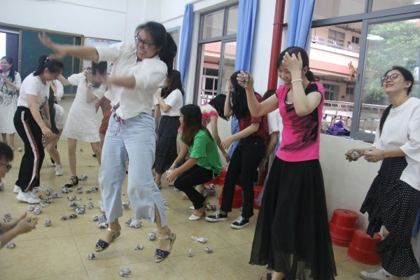 在 “紙團大戰”中,大家更是把種種壓力、不良情緒都化作一個個廢紙團,扔向遠方,也可以把紙團看作愛,把愛送出去,收獲更多的愛,老師們全身心都得到了放松與釋然。