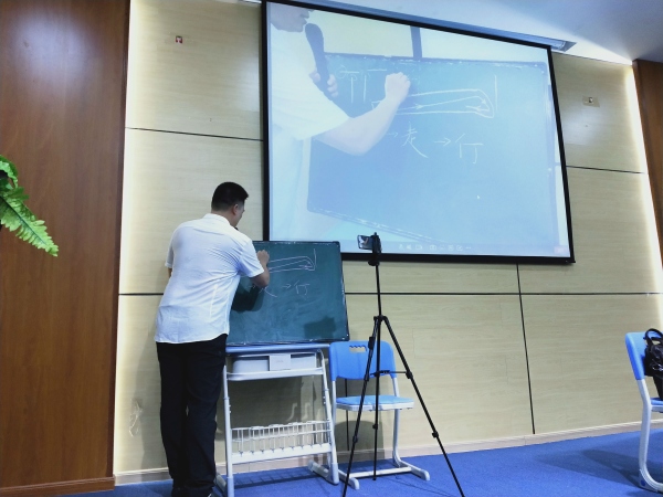 蕭老師從書法基礎知識拉開講座的序幕,從書法的筆法、結構、規律做了細致的闡釋,重點指導了漢字的基本筆畫及結構規律。在黑板演示握筆、落筆、起筆、運筆、收筆的要領,深入淺出地向老師們講解了基本筆法、間架結構的書寫要領。蕭老師利用自己扎實的書寫功底為全體教師進行了很好的示范,現場一筆一劃地教大家寫字,個別展示的方式讓老師們在寓教于樂中輕松掌握書寫方法。